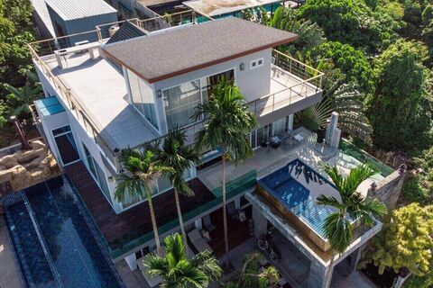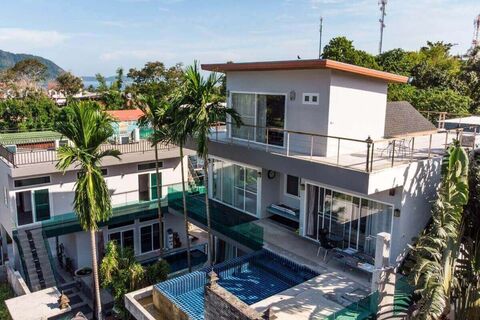 On the ground floor is an open plan living and dining area as well as a large bedroom, a study and a laundry room. On the 2nd floor is the master bedroom as well as 2 additional bedrooms. On the top level or 3rd floor is a 5th bedroom with access to the roof terrace views of Chalong Bay, the Big Buddha and the lush tropical surroundings. Next to the main house is a separate build with 3 bedrooms.
