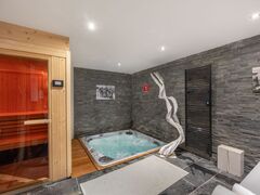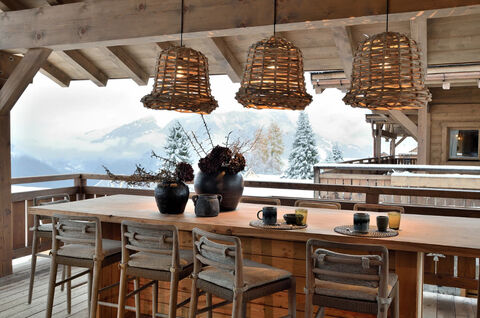 Crafted in traditional post-and-beam style with a shingle roof and copper details, the chalet features an expansive 87 sq.m open-plan living space with a fireplace that opens onto a generous terrace — the perfect setting for apres-ski moments. The wellness area includes a sauna, herbal tea room, billiards, and a cosy TV lounge for relaxed evenings.