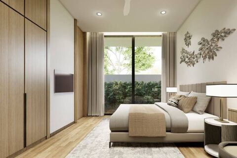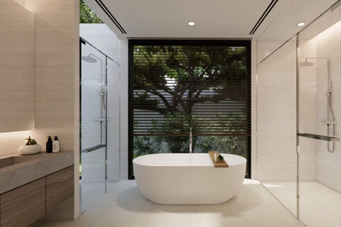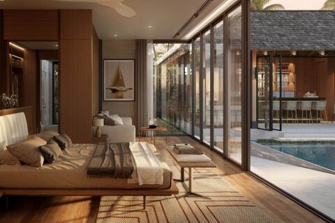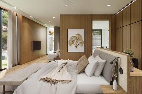 Villas have a built-up area of 515-718 sqm, shaped in a U around the swimming pool and set on plots ranging from 644-1,000 sqm. Interior areas range from 295-431 sqm and all rooms fall under a common roof. All 5 bedrooms have ensuite bathrooms and 2 of the bedrooms are configured as master bedrooms with walk-in closets and a lounging area. There are 2 guest bathrooms/powder rooms and 2 outdoor showers. The pavilion or sala is a fully-functioning outdoor living area with a lounging chairs, dining table, full kitchen facilities and a bar. There is a maids room with a kitchen, bathroom and small terrace.
