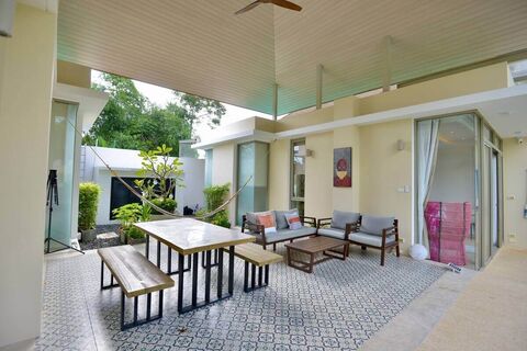 This 6 bedroom family villa with a large pool is near UWC International School in Thalang, Phuket. The joining together of 2 separate villas was well thought out and carefully planned. The end result are 2 separate structures with a spacious sala in between. In front of the property, a 20 metre private pool spans the width of both villas. In front of the sala is the shallow part of the pool, perfect for young children.