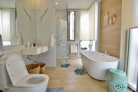 This villa - numbered 88 - has elegant and yet comfortable interiors. Each building has a master bedroom with an ensuite bathroom and bathtub, as well as 2 guest bedrooms with a shared bathroom. One of the smaller bedrooms currently serves as a maid's room. Therefore, the owners have added a small bathroom for her use.