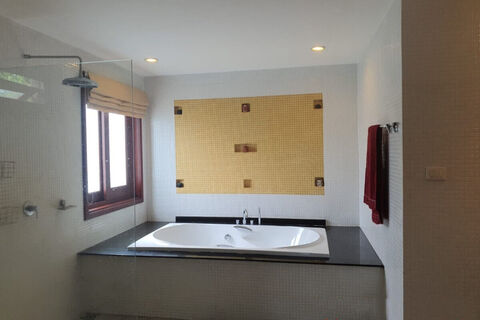 There are 4 bedrooms, all with aircon, TV and en-suite bathrooms. In addition there is one extra room near the garden with a guest bathroom which can be used as a maids room.