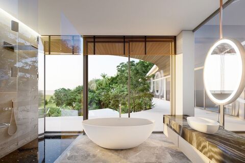 This 1,847 sqm villa is built only over 2 levels, spread out on a huge plot of 2,144 sqm. The main level consists of a garden, a covered 4-car garage, dining, living and kitchen areas, laundry room, maids room, guest bathroom, home theatre and a bedroom. The villa is built curiving around a massive pool terrace with a sunken lounge, outdoor dining table, sun loungers and 153 sqm swimming pool overlooking the sea and the mountain.