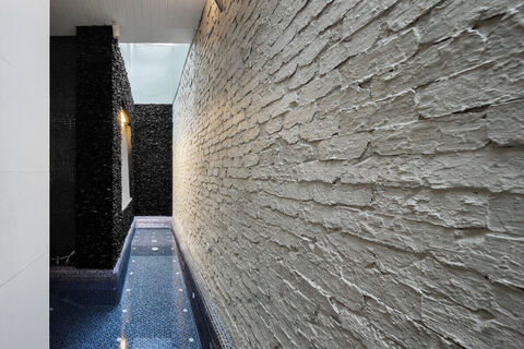 Upstairs from the central level landing area is the upper floor and one of the 2 master bedrooms. The bedroom has a large bathroom and a separate walk-in dressing room and wardrobe area. The main feature of this bedroom are the circular doors which slide open to reveal amazing views of the bay and the ocean.