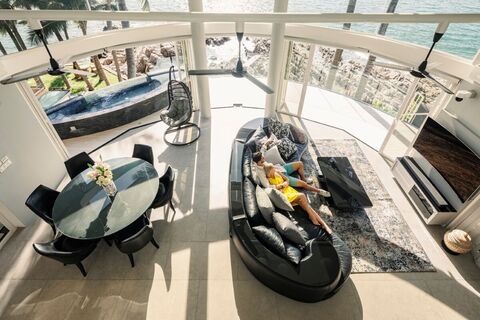 Double storey picture windows frame the living area, showcasing the entire Patong Bay and flooding the villa with natural light and the awesome view of glorious sunsets.