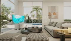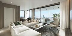 This beautifully designed apartment offers a blend of modern luxury and laid-back Mediterranean living, clean contemporary lines are softened by the welcoming atmosphere of a true home, creating a stylish yet liveable retreat. The expansive open-plan living and dining area is filled with an abundance of natural light filtering through the large double-glazed windows and patio doors, which leads directly out onto the part covered terrace, an ideal spot to unwind and soak in the stunning coastal views, all from the comfort of your own home. The modern fitted kitchen has a high-quality crisp white finish, with ample worktops and storage and all the latest top-quality fixtures and fittings, perfect for all your kitchen needs. There are two double bedrooms the master boasting an en suite with shower unit, both bedrooms designed to a high standard with floor to ceiling fitted wardrobes, plus there is a fully tiled family bathroom kitted out with a walk-in shower unit.