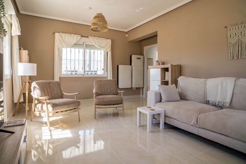 The house is excellently equipped in terms of amenities: A connection to the Pinoso water network, 16 solar panels with a 5 kW inverter, and a 20 kWh battery pack ensure energy-efficient living. There is both an electric boiler and a gas boiler, both newly installed in 2024. There is also a connection to the Pinoso water network. Furthermore, the plot features an electric gate with a possible water connection, a carport for two cars, a tool shed, a brick shed, and additional storage space for the wood-burning stove, among other things. Four air conditioning units ensure comfort in all seasons. The house is offered unfurnished, but this is negotiable.