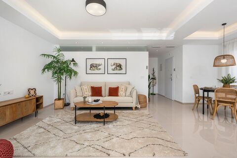 Step into this bright ground-floor 2-bed/2-bath apartment and feel the space unfold. To the left, a generous open-plan living area welcomes you — stylish, flexible, and perfect to design your way. The modern corner kitchen blends seamlessly with the lounge and dining area, while large sliding doors lead you to a private terrace and garden overlooking the central pool and community area.