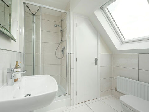 The maIn bedroom spans the second floor of thIs home, featurIng a dormer wIndow to the front and a skylIght wIndow at the back, creatIng a lIght and aIry space. There's also an en-suIte complete wIth a shower enclosure, and there's a famIly bathroom that features a double ended bath, both are complete wIth Porcelanosa tIles and whIte sanItaryware.