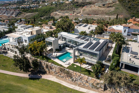Newly built contemporary villa situated in the prestigious urbanization of La Alqueria, Benahavis. Positioned frontline golf and facing east to south, the property offers panoramic views of the Mediterranean Sea, the coastline, and the iconic La Concha mountain.