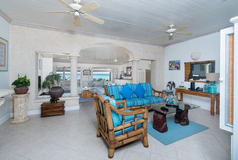 The bright and tastefully decorated entrance leads you into the spacious living room with its columns of natural stone and breath taking panoramic views of the turquoise Caribbean Sea.