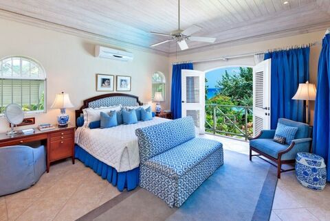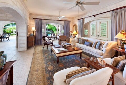 This luxury Barbados vacation rental features a Roman-style fountain in a small alcove and a slightly dimmed nook offers a cosy retreat. The drawing room is elegantly outfitted with mahogany furnishings, antique Oriental rugs and polished antique mirrors. The living areas flow onto a covered terrace that is fully equipped with a full dining area, recessed service counter and a wet bar.