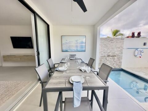Outdoors, enjoy your private plunge pool and landscaped terrace — perfect for relaxing under the tropical sun or entertaining in style. The property also includes private parking for two vehicles and the peace of mind within this well-maintained community.