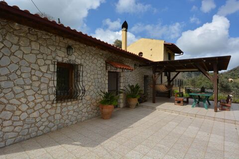 The main house consists of the living room with the imposing fireplace, a second smaller living room, a spacious kitchen, a bedroom and a bathroom. Wood, stone and arches in a harmonious combination create a warm and traditional atmosphere. From the living room an internal wooden staircase leads to the spacious and bright bedroom. The house has large paved terraces, a tiled pergola and a traditional wood oven.