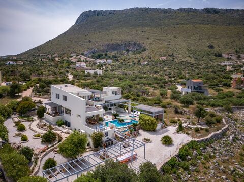 Positioned on the ascent to Drapanos, near the charming old village of Kokkino Chorio, this expansive villa enjoys a convenient location equidistant from Chania and Rethymnon. During the winter months, guests are treated to awe-inspiring vistas of snow-capped mountains to the left, a panoramic view of Souda Bay to the right, and an uninterrupted sightline all the way to Chania and the mesmerizing Cretan sea.