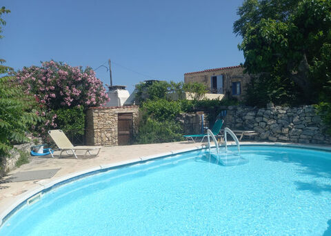 In front of the house there is a swimming pool and a stone-lined platform for sunbathing.
