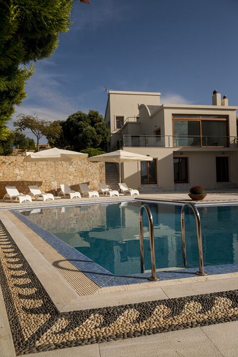 The villa is of 220 sqms has 3 bedrooms and 3 bathrooms. There is also an extra studio with a bedroom and one bathroom available, which can be either connected to the villa or it can be totally independent with a separate entrance. Due to the fact that the plot is gradient, the villa enjoys panoramic views of Kalathas gulf and the mountains.