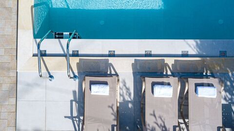 A beautiful open-plan living room with fireplace and dinning area and a fully-equipped kitchen are provided on the ground floor. There is also a bathroom on this level and access from the living area to the pool terrace.