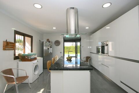 inside, the home offers five spacious bedrooms and four bathrooms. Upon entering, a bright hallway leads directly to the garden, while to the other side, you'll find a large living room and a fully equipped kitchen with an island that opens to the barbecue area and connects seamlessly to the pool. This level also includes a master bedroom with an ensuite bathroom and a second spacious bedroom with its own bathroom.