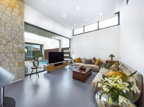 As you enter the property you will find a beautiful courtyard, with a pool that also doubles up as a jacuzzi. In the courtyard you also have a seating area which is surrounded by full height windows that allow you to see into the house, providing a feeling of spaciousness.