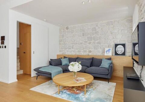 The property has been completely renovated. A minimalist interior design approach, featuring exposed stone walls, seamlessly harmonizes the historical Mediterranean ambiance with a contemporary living concept, creating a unique and captivating living space.