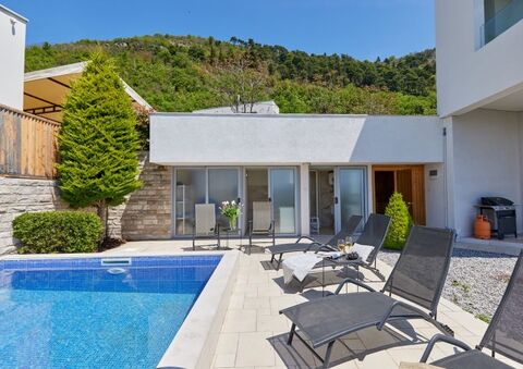 The villa comprises a living room with a fireplace and panoramic windows with a beautiful view of Tivat Bay, a kitchen and dining room, three bedrooms, and three bathrooms (the master bedroom is en suite).