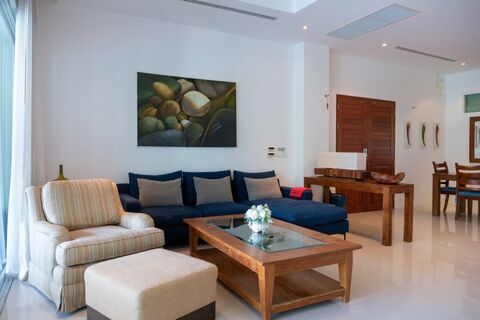 Step into this deluxe and contemporary home and immediately feel right at home. The spacious open living area flows from the living room and dining room immediately to the private pool and terrace with sweeping sea views.