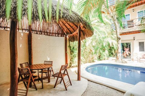 Key Features: Furnished, parking, 2 independent entrances, private pool, ocean view, equipped kitchen, air conditioning, terrace, access to Mamitas Beach and Fifth Avenue, ideal for vacation rentals.