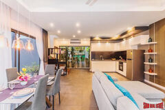 The apartment has a large open living plan than includes a living room with sofa and a flat screen TV. The dining room is located next with a table and four chairs. Following this is the Western kitchen. It is fully equipped and includes a stovetop, refrigerator, washing machine and a built-in microwave.