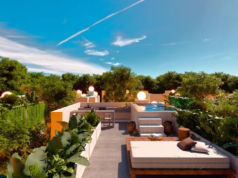 Spaces: Fully equipped kitchen, laundry areas, private terraces.