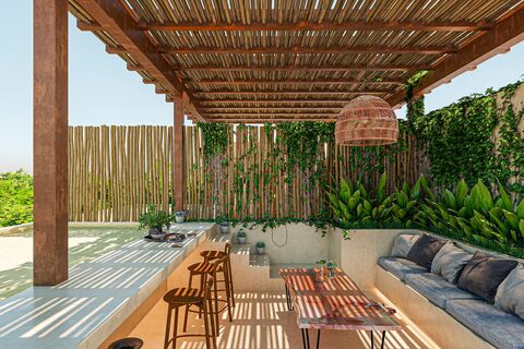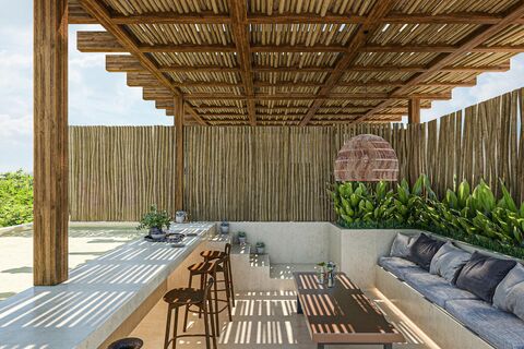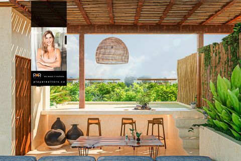 The intelligent layout maximizes both functionality and the feeling of spaciousness, allowing the tropical breeze and natural light to flow freely throughout the residence. The meticulously selected finishes reflect the organic essence of Tulum, using natural materials that evoke warmth and sophistication, creating an environment that is both luxurious and welcoming. The private terrace becomes an essential extension of your living space, an intimate spot to start the day with birdsong or to enjoy warm tropical nights under a blanket of stars, activating those moments of deep peace we all seek.