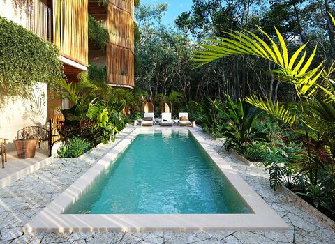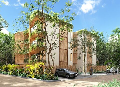 Imagine a space where contemporary design meets the serenity of nature, creating a personal sanctuary that awakens all the senses. This exclusive 190-square-meter, two-bedroom apartment represents the essence of modern luxury in Tulum, where every detail has been meticulously planned to deliver a transformative living experience. Upon crossing the threshold, you'll be greeted by a sense of spaciousness and fluidity that invites immediate relaxation, with areas that harmoniously connect to linked terraces, creating a natural expansion that blurs the boundaries between indoors and the lush exterior landscape. This home not only meets practical needs but evokes deep emotions of peace and wellbeing, turning every moment into a celebration of Caribbean life.