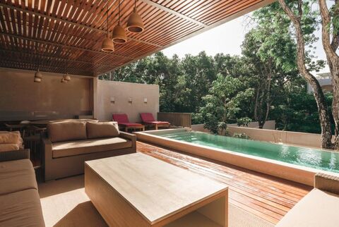 The interior of the home is a testament to sophistication and functionality, with a fully equipped kitchen featuring high-end appliances that becomes the heart of the household. The indoor dining area seats ten people, perfect for large gatherings, and flows seamlessly onto an outdoor terrace with separate lounge and dining spaces, completely blurring the boundaries between inside and outside thanks to its sliding glass doors that retract into the walls. This unique integration creates an open-air oasis that invites relaxation and entertainment, surrounded by Tulum's lush vegetation.