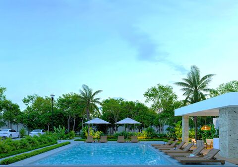 This 187 m2 residence redefines contemporary elegance by blending indoor and outdoor spaces through high ceilings, porcelain floors, and expansive windows that invite natural light. Featuring 3 bedrooms, 3 full bathrooms, and a private pool, its fluid design merges luxury with environmental harmony. The terrace, equipped with a BBQ area and lounge spaces, extends into lush gardens, while covered parking for a vehicle + golf cart adds practicality to sophistication.