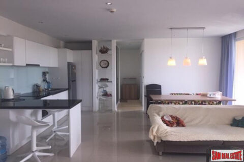 A large two bedroom, two bath condo is for sale in the Atlantis Condo Resort Pattaya A. It is located on the 4th floor, fully furnished and is over 72 sqm large. The open living space includes a big living room, a dining area that seats four and a western kitchen that has many white cabinets and a large counter top. This area opens out to a nice balcony that runs the length of the living space and has a sitting area to catch the nearby ocean breezes.