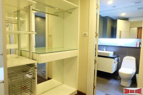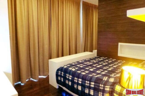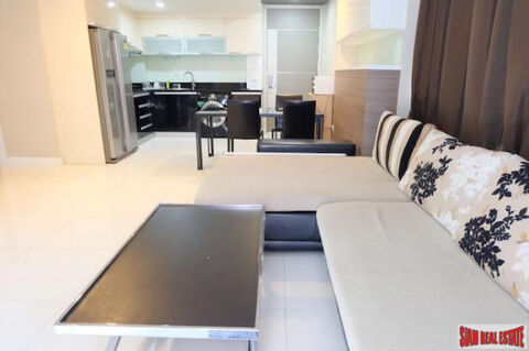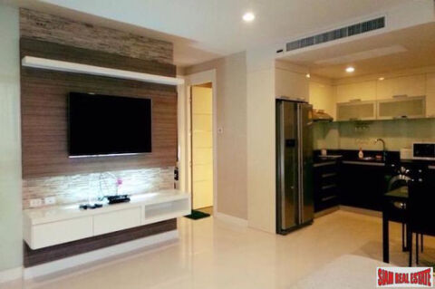 A three bedroom unit with a pool view is available for sale at the Apus Condominium. This 118 sqm three bedroom, three bath is located on the ground floor and sold fully furnished. There is a large European kitchen with contemporary appliances and a washing machine. The open living plan includes a living room with a wall mounted TV and dining area.