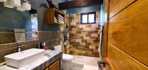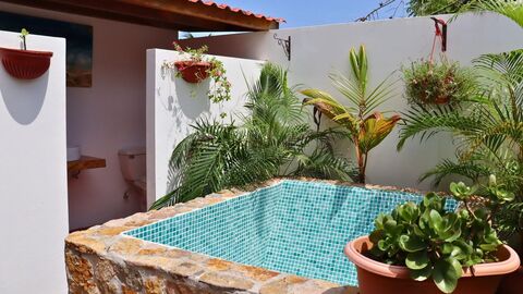 Casita features: The casita bedroom has a Samsung AC as well. A beautifully tiled bathroom attached to the bedroom. The gorgeous countertop in the casita kitchen is made from a huge mango tree. Included in the casita kitchen is a wood-burning pizza oven. The kitchen is completely screened in and has a glass door that leads to the stunning outdoor tub area, which is surrounded by more beautiful plants and has an outdoor shower and bathroom too. This tub area has a majestic wall of teak wood, adding to the beauty of this space. Enjoy a romantic bath under the stars!