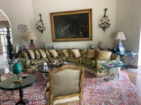 The dining room is also state-of-the-art, combining marble and wood floors, walls covered by an exquisite Scalamandre silk fabric, and a ceiling with custom-made mirrors. Below the dining room is a secret vault that leads to an antique wine cellar.