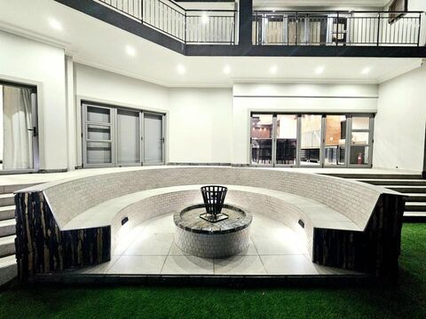 Driving into the property you are met with a big paved driveway leading to the main entrance with parking space for ten or more cars. On both sides of the main entrance, you will find 6 spacious garages fitted with automated wooden garage doors, all tiled floors with ample built-in cupboard storage space. In the front of the driveway, you will find a big communal green area, with a big lawn.