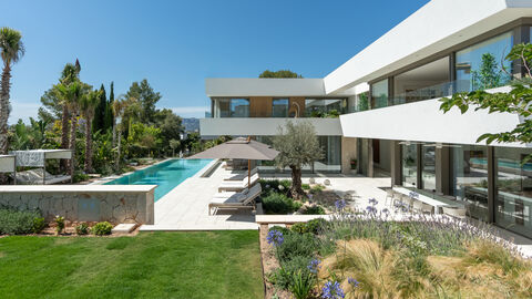 This stylish new-build villa is located in the upmarket residential area of Nova Santa Ponsa and has only recently been completed. The exclusive property impresses with its architectural sophistication, high-quality building materials and exceptional fixtures and fittings. It sits on a plot of approx. 2,030 m2 in the immediate vicinity of the golf course. The south-facing orientation promises many hours of sunshine. On a constructed area of approx. 984 m2 there are 4 bedrooms, 5 bathrooms, guest apartment, living/dining area, fully equipped fitted kitchen, utility room, storage room, wine cellar, cinema/hobby room and a utility room. A bright and open room concept with a modern ambience is created on 2 living levels. Energy-efficient living is made possible by state-of-the-art heat pump technology and solar energy. Further high-quality features: Fireplace, Schüko windows, air conditioning, underfloor heating, smart home control, alarm system and much more. The outdoor area with a refreshing saltwater pool, surrounded by sun terraces, a modern summer kitchen and a well-tended garden is the perfect place for socialising in the afternoon. The covered carport and the barbecue area with remote-controlled slats provide shade, air permeability or rain protection as required.