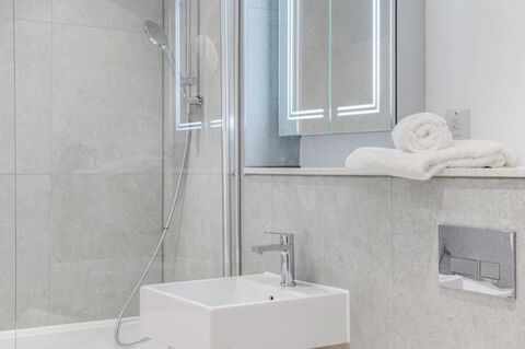 The generously sized bedroom provides a tranquil retreat, complete with bespoke wardrobes offering ample storage. The stylish bathroom boasts contemporary fittings and elegant finishes, elevating your daily routine.