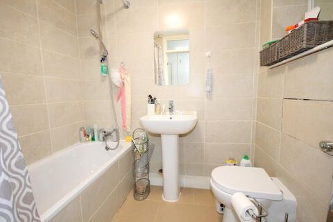 2.03m x 1.65m (6' 8" x 5' 5") tiled panelled bath with mixer tap and shower spray, pedestal wash basin and mixer tap, toilet with concealed cistern, chrome towel rail/panelled radiator, extractor fan, fully tiled walls and floor, mirrored recess