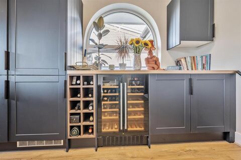 Kitchen Area - Double glazed windows to front and side, range of wall, drawer and base units with worksurfaces over, sink and drainer with mixer tap, oven and hob with concealed hood over, integrated appliances: dishwasher, washing machine, fridge/freezer, two wine coolers, breakfast bar, 'Valiant' boiler (not tested by Charles Eden), laminate wood flooring.