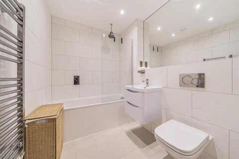 Bathroom/Wc - Recessed spot lights to ceiling, paneled bath with shower, wash hand basin with mixer tap inset in wall hung two drawer unit, low level WC, chrome ladder style heated towel rail, fully tiled walls, tiled flooring.