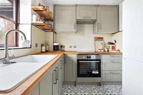 Kitchen - 2.97m x 2.21m (9'09 x 7'03) - Double glazed window to front, comprising a range of wall, base and drawer units with rustic oak effect worksurfaces over, single bowl sink and drainer with mixer tap, induction hob with cooker hood over, single oven, integrated dishwasher, spaces for: fridge freezer and washing machine, vinyl flooring.