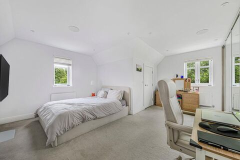 The first floor hosts three well-proportioned double bedrooms, one of which benefits from a sleek en-suite shower room. A modern family bathroom serves the remaining two bedrooms. Occupying the entire top floor is the impressive master suite, complete with a large en-suite bathroom featuring a walk-in shower, extensive fitted wardrobes, and generous under-eaves storage.