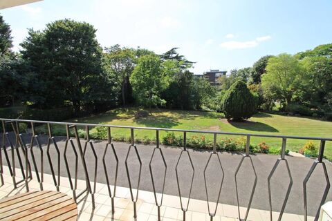 to rear of property laid to lawn with established tress and small pond all rooms in this flat and the balcony have views over this park-like area. Parking available to front.