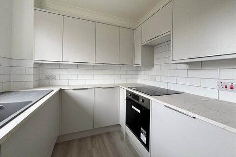 2.19m x 1.82m (7'2 x 6'0) brand new with good range of base cupboards plus drawers and integrated fridge with freezer compartment beneath work surfaces, inset single drainer Franke sink with mixer tap, 4-ring touch control ceramic hob with electric oven beneath, wall tiling, eye level cupboards, wood effect flooring, double glazed window to front
