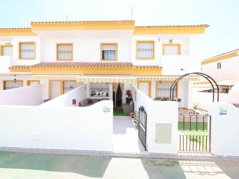 This well-appointed duplex townhouse is located within the desirable Residencial Canada Real in Torre de la Horadada. Situated directly facing the inviting communal pool, the property offers a comfortable living space of 70 square meters. Inside, you will find two well-proportioned bedrooms and two modern bathrooms, ensuring ample space and convenience. The layout features a bright and airy living room seamlessly connected to an open-plan kitchen, creating a sociable and functional area. Large rear patio and large tiled terrace of approximately 20 square meters provides direct and easy access to the communal swimming pool. The townhouse is offered for sale fully furnished and equipped, including air conditioning. Extensive maintained green areas and 2 communal swimming pools. This property presents an excellent opportunity for those seeking a ready-to-move-in home in a sought-after location with all amenities and the beach in walking distance.