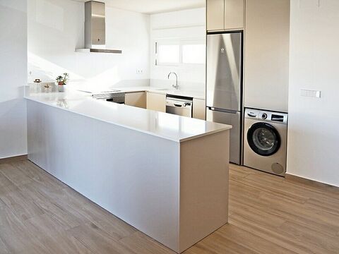 Get More Than a Home: A Furniture & Lighting Package is on Us! Discover these stunning penthouse apartments . 2-bedroom, 2-bathroom (master ensuite) perfectly situated on Vistabella Golf Resort. This home features an inviting open-plan living/dining room with a fitted kitchen and convenient breakfast bar. Includes air conditioning and shower screens. Outdoors, you'll find generous private terraces and impressive 68-882 private solariums (accessed directly from the terrace), both overlooking the beautiful communal pool and gardens.